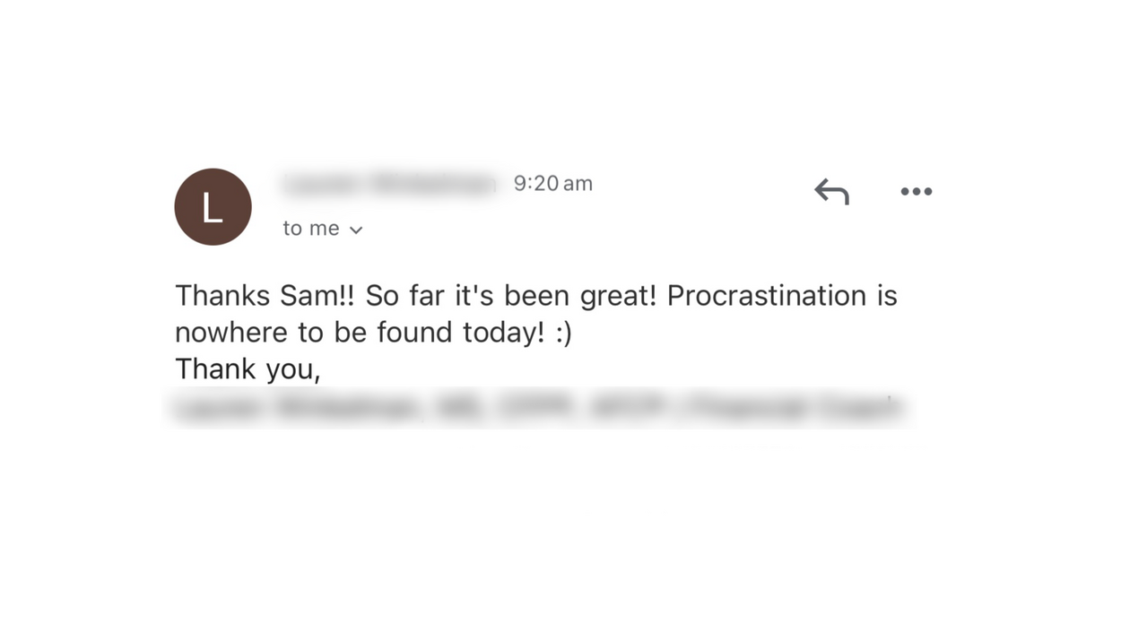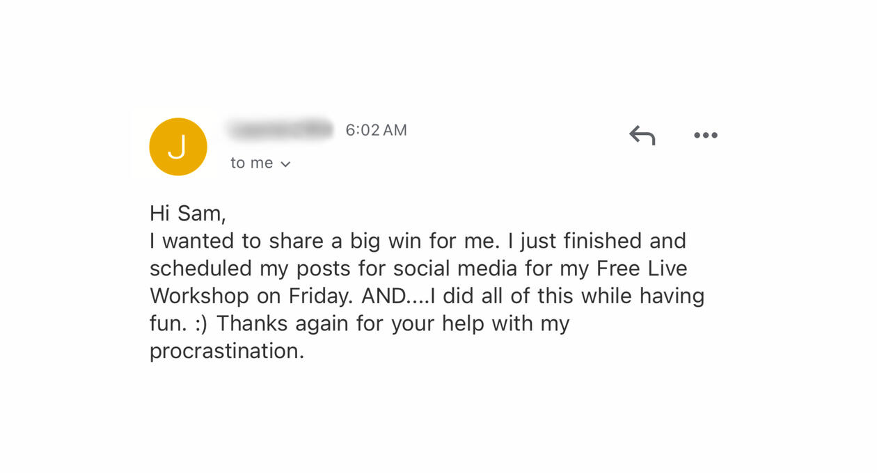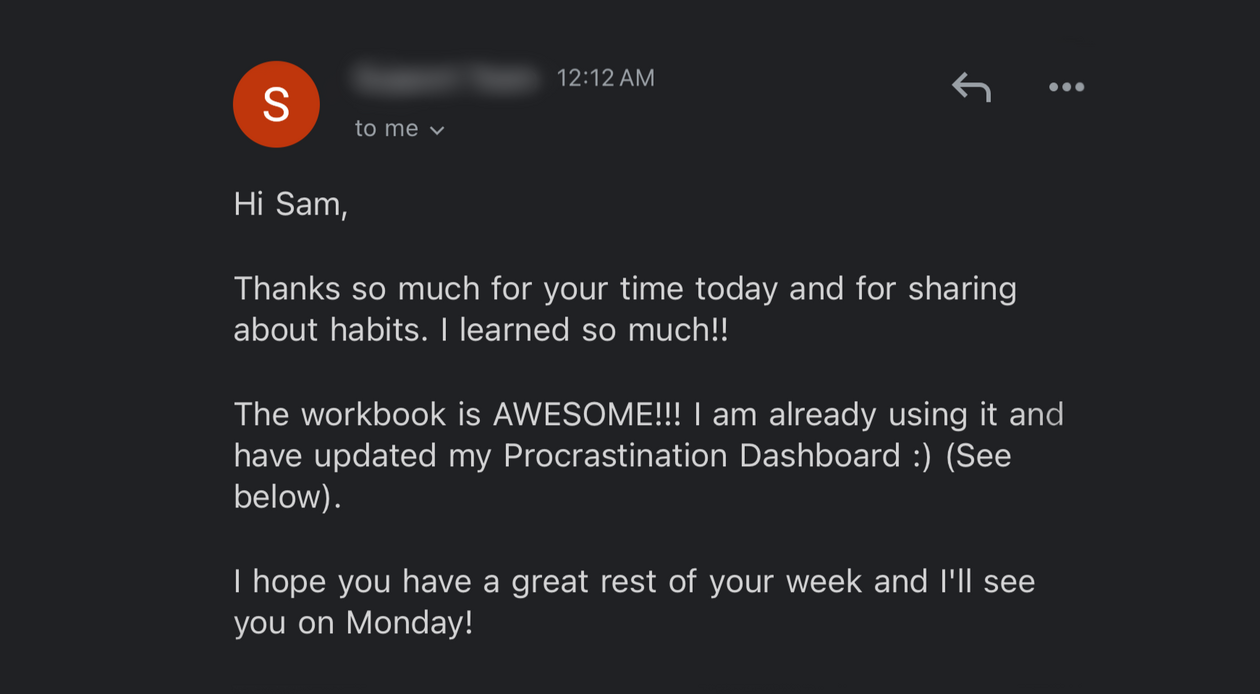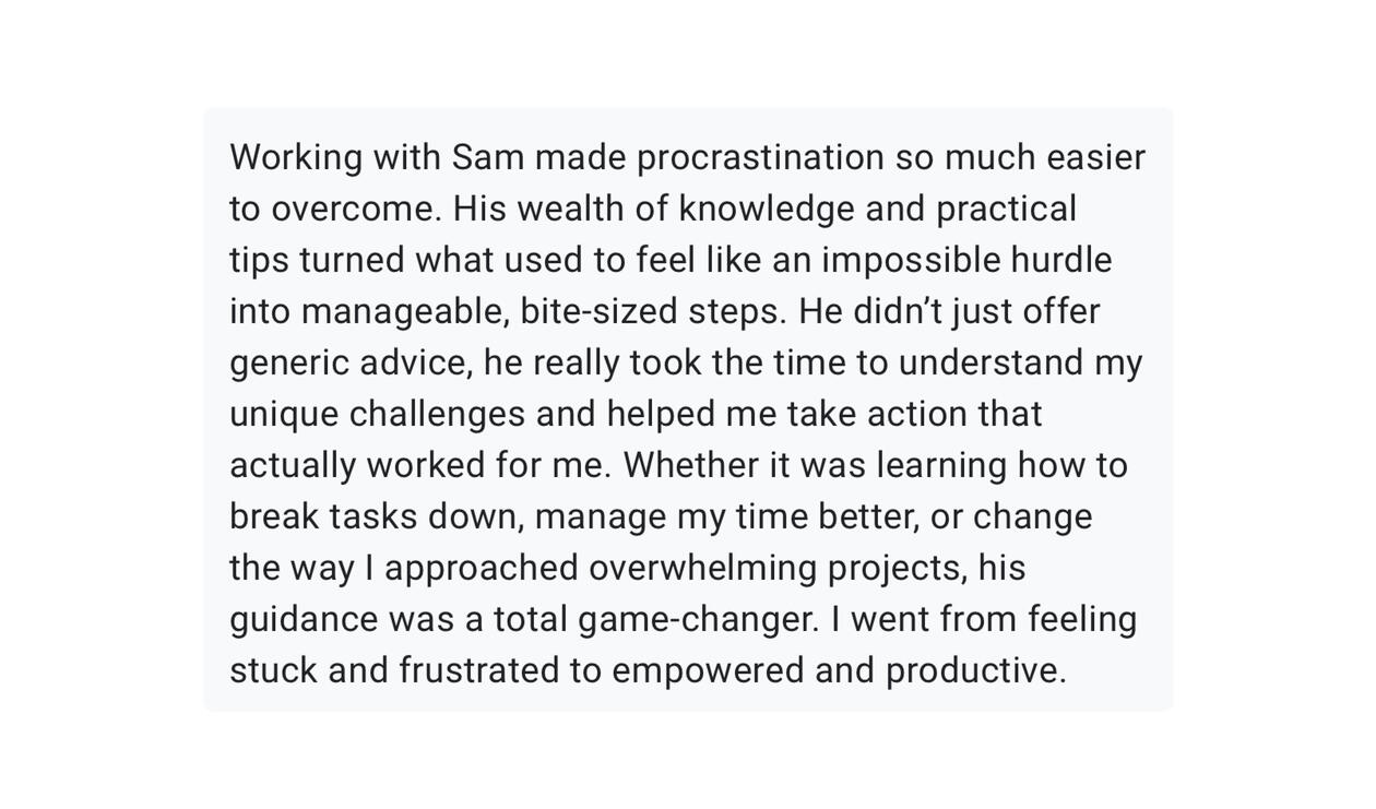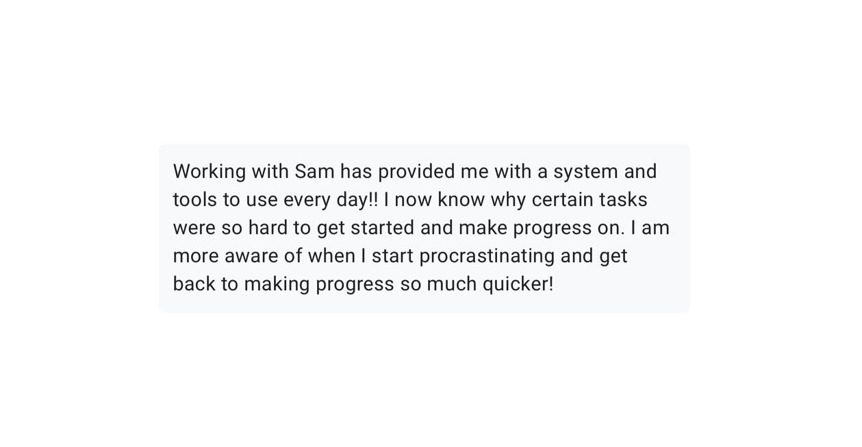 "Working with Sam has made procrastination so much easier to overcome.I went from feeling stuck and frustrated to empowered and productive. I now know why certain tasks were so hard to start and stay consistent with.If I could chat with past me, I'd say stop overthinking and just work with Sam. He’s going to help you tackle procrastination in ways that actually work.You'll get so much clarity and confidence. You'll wonder why you waited so long to take this step"
