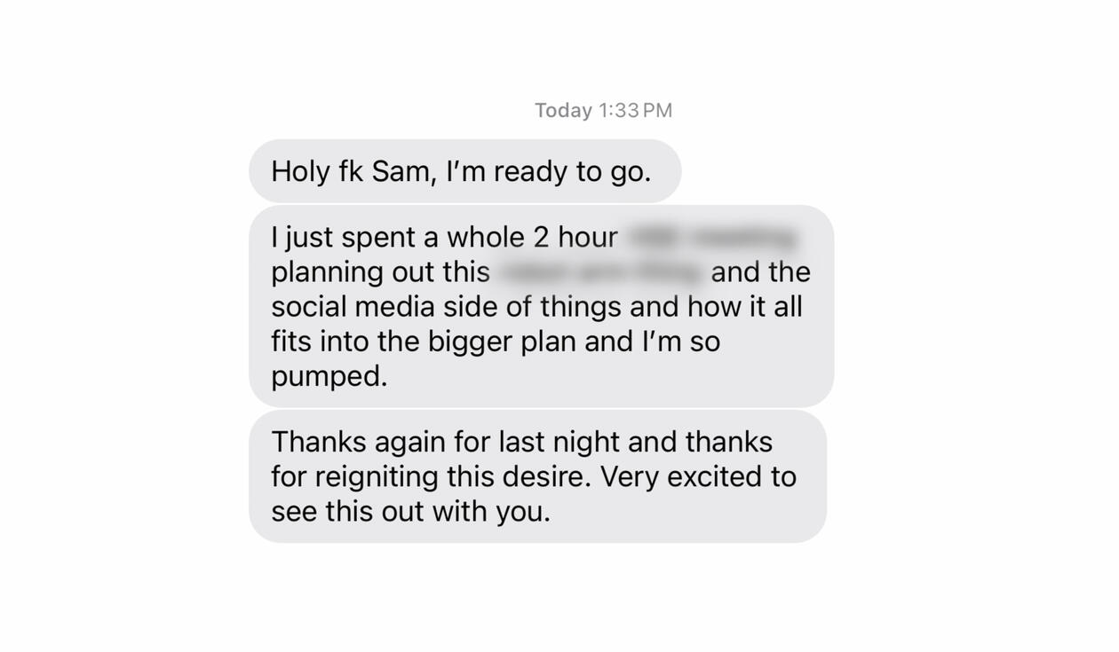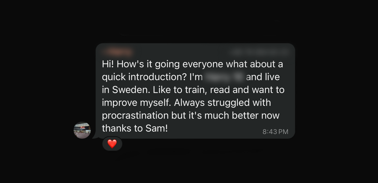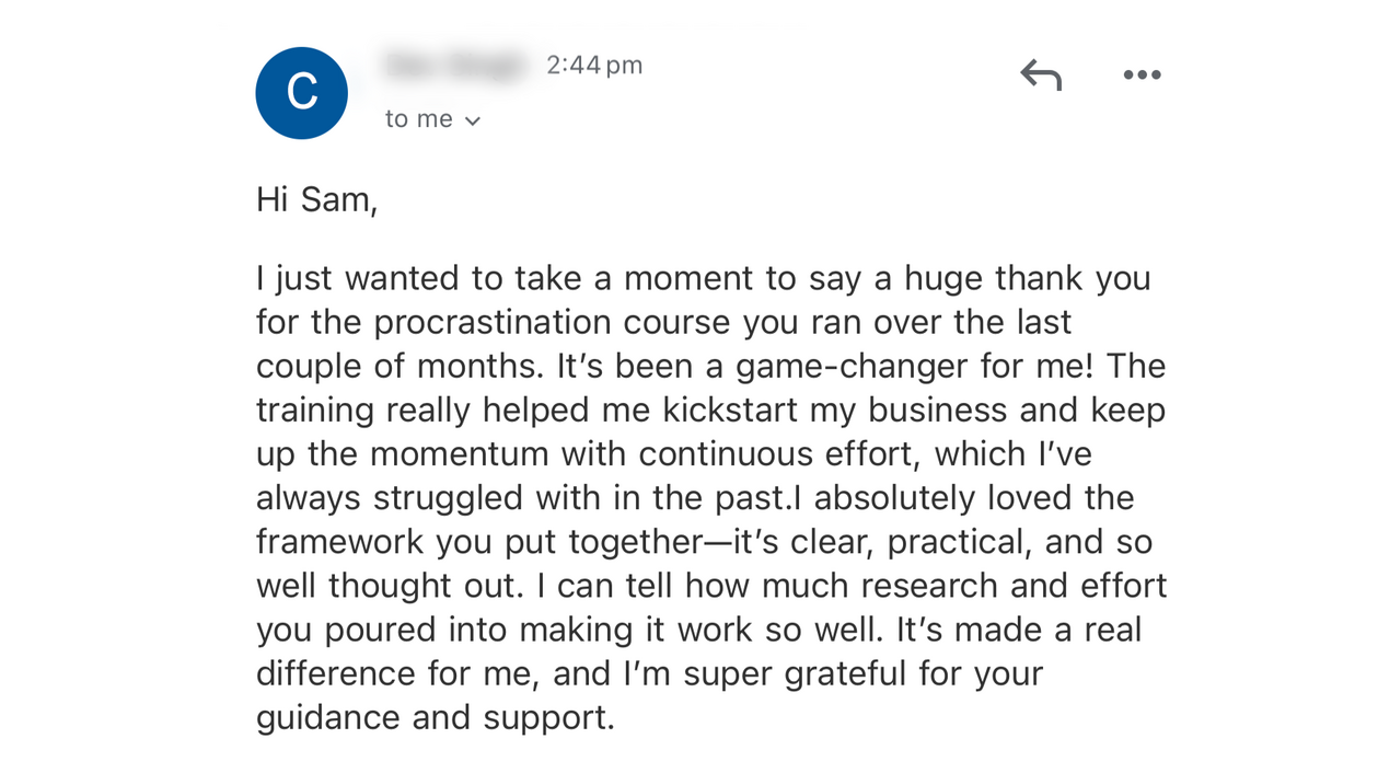 I thought Sam's program would be the same information I've seen thousands of times on the internet. But after just the first session I realised I was wrong.I've tried everything to fix my procrastination. But after just 1 week I finally started working on the business I've been thinking about for years.Everything is so clear. I finally know why my brain wants to procrastinate and how to stop those urges.I’ve already recommended Sam to 3 other people and will continue to do so.He’s an amazing person to have in your life if you’re someone with big goals but unsure how to achieve them.